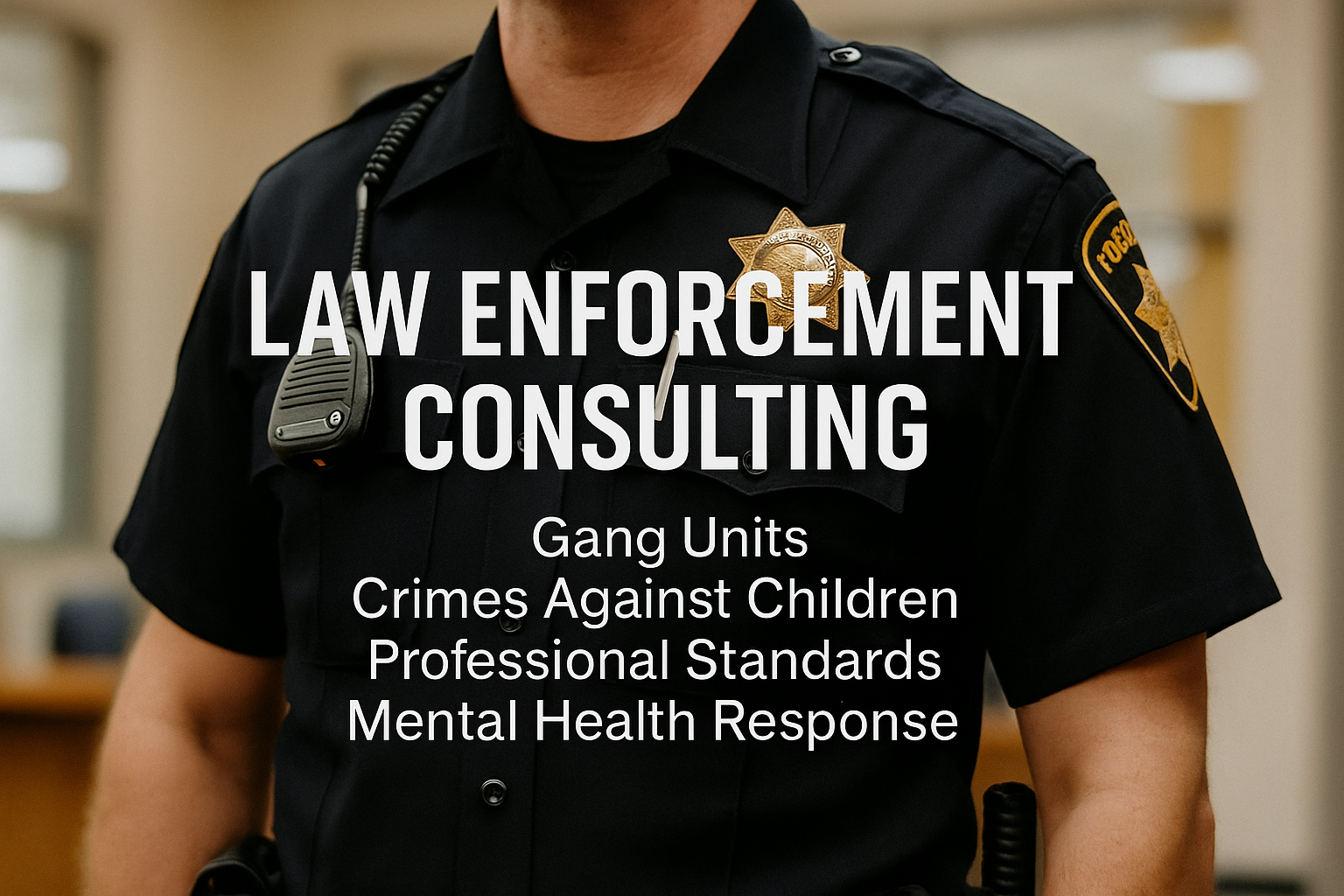 A law enforcement officer in uniform with a police badge and radio on his shoulder, with overlaid text reading 'Law Enforcement Consulting' and bullet points for 'Gang Units,' 'Crimes Against Children,' 'Professional Standards,' and 'Mental Health Response.'